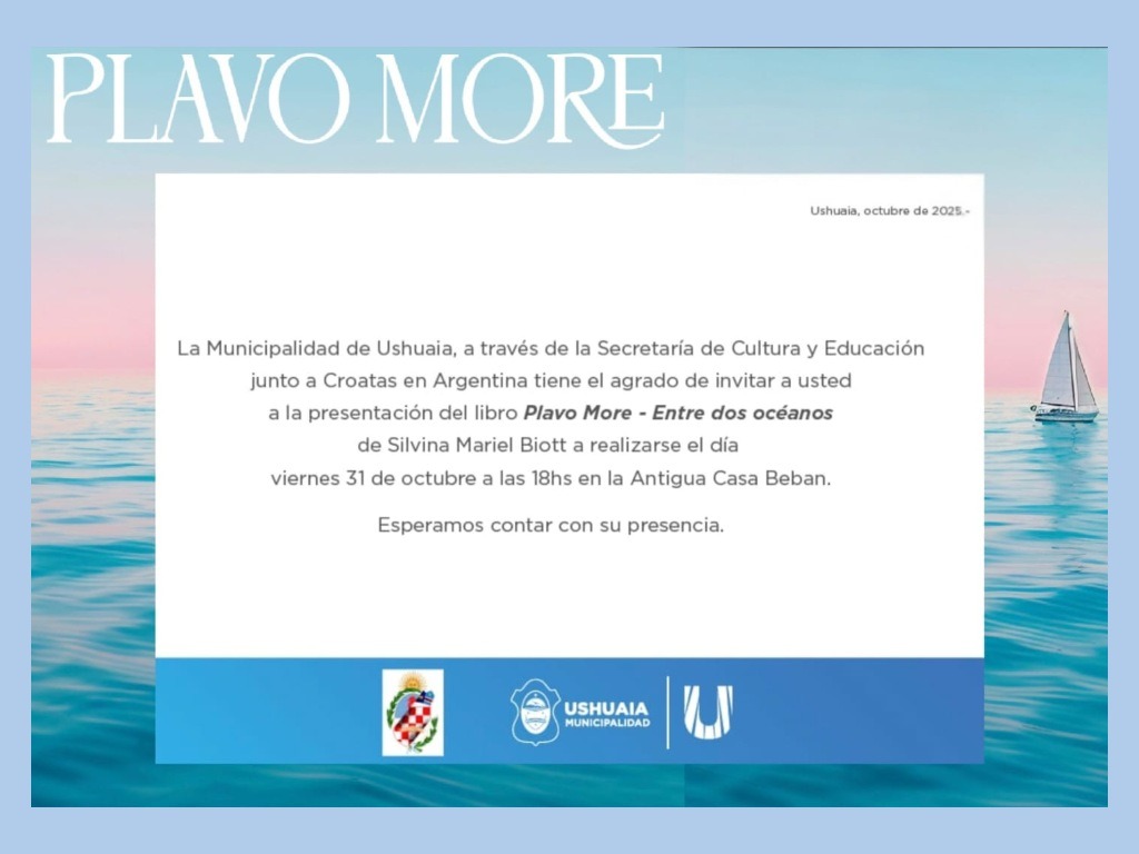 La Municipalidad de Ushuaia, a través de la Secretaría de Cultura y Educación, junto a Croatas en Argentina invitan a la presentación del libro “Plavo More – Entre dos océanos”, escrito por Silvina Mariel Biott.